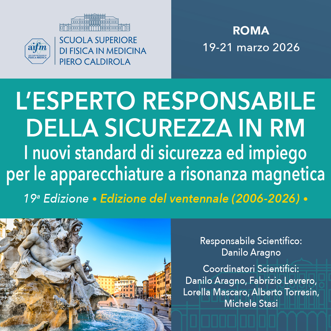 A vent’anni dalla prima edizione del Corso per Esperti Responsabili della Sicurezza in Risonanza Magnetica, organizzato da AIFM e dalla Scuola Superiore di Fisica in Medicina Piero Caldirola, il Corso si svolgerà nelle sede dove si tenne la prima edizione del 2006, l’Azienda Ospedaliera San Giovanni-Addolorata di Roma. ll Corso di Formazione mantiene anche in questa edizione il nuovo format introdotto nelle ultime edizioni. Infatti dopo le prime 10 edizioni consecutive nelle quali ha avuto come obiettivo di fornire gli strumenti teorico-pratici fondamentali per interpretare con elevata professionalità il ruolo di Esperto Responsabile, nelle successive edizioni il Corso si è proposto di affrontare le novità tecniche e normative introdotte nel panorama italiano ed internazionale e il loro impatto per l’attività dell’Esperto Responsabile della Sicurezza. In particolare verranno approfondite sia le novità di tipo normativo introdotte dal DM 14 gennaio 2021 sia le innovazioni proposte da documenti tecnici emessi a livello nazionale ed internazionale relative alla sicurezza del paziente e dell’operatore. Come nelle ultime tre edizioni ci sarà un anche un focus sui campi ultra alti.Particolare attenzione verrà dedicata ad illustrare, sia con relazioni frontali che con esercitazioni pratiche e role-playing a piccoli gruppi, aspetti connessi alla progettazione del sito, alla gestione dei dispositivi impiantabili, ai controlli di qualità ed alla predisposizione delle relazioni tecniche di competenza dell’ER, quali quelle previste per la comunicazione di avvenuta installazione e per la valutazione dei rischi. Non mancherà anche in questa edizione la tradizionale sessione dedicata alla preparazione delle verifiche ispettive con sopralluogo in SITO RM a piccoli gruppi.