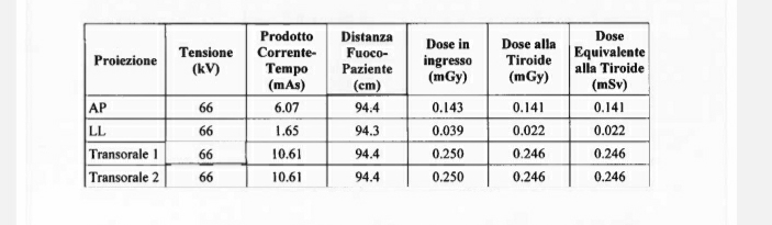 Purtroppo e me ne dispiaccio fortemente, non è stato utilizzato il collare di protezione alla tiroide che quindi è stata completamente irradiata specie nelle 2 transorali che hanno una dose più alta.
