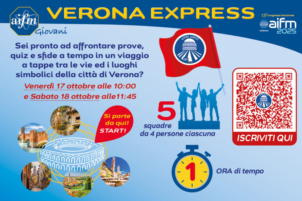 A tutti i partecipanti del Congresso AIFM 2025 che desiderano aggiungere un tocco di originalità alla propria esperienza congressuale. Che tu sia un giovane specializzando,  un giovane professionista o un veterano della Fisica Medica, il Verona Express è aperto a chiunque abbia voglia di partecipare, divertirsi e lasciarsi sorprendere.