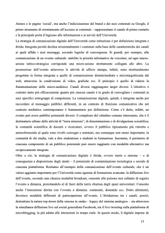 La strategia di comunicazione digitale dell’Università come istituzione è per definizione integrata e ibrida. Integrata perché declina orizzontalmente i contenuti sulla base delle caratteristiche dei canali ai quali affida i suoi messaggi, secondo logiche di convergenza. Si guardi, per esempio, alla comunicazione di un evento culturale: stabilite le priorità informative da veicolare, ad ogni macro- azione tattico-strategica corrisponde una micro-azione strettamente collegata alle altre. La promozione dell’evento attraverso le attività di ufficio stampa, infatti, sono strutturalmente progettate in forma integrata a quelle di comunicazione disintermediata e microtargettizzata dal web, attraverso la condivisione di video, grafiche ecc. Il principio è quello di ridurre la frammentazione delle micro-audience. Canali diversi raggiungono target diversi. L’obiettivo è centrato tanto più efficacemente quanto più ciascun canale è in grado di convogliare i contenuti ai suoi specifici sottogruppi di competenza. La comunicazione digitale, quindi, è integrata anche per raccordare al messaggio pubblici differenti, in un contesto di fruizione comunicativa che nel contesto mediatico contemporaneo è frammentario per definizione. Come s’è detto, infatti, un evento può avere pubblici potenziali diversi: il complesso del cittadino comune interessato, che è il destinatario ultimo delle attività di “terza missione”, di disseminazione e di divulgazione scientifica; la comunità scientifica di docenti e ricercatori, ovvero il pubblico tipicamente più ristretto e autoreferenziale al quale sono rivolti convegni e seminari, ma comunque non meno importante; la comunità di chi studia, vale a dire studentesse e studenti in formazione. Insomma, il perimetro di ciascuna componente di un pubblico potenziale può essere raggiunto con modalità alternative ma reciprocamente integrate.