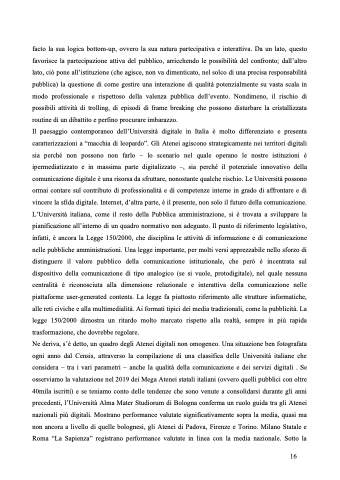 Il paesaggio contemporaneo dell’Università digitale in Italia è molto differenziato e presenta caratterizzazioni a “macchia di leopardo”. Gli Atenei agiscono strategicamente nei territori digitali sia perché non possono non farlo – lo scenario nel quale operano le nostre istituzioni è ipermediatizzato e in massima parte digitalizzato –, sia perché il potenziale innovativo della comunicazione digitale è una risorsa da sfruttare, nonostante qualche rischio. Le Università possono ormai contare sul contributo di professionalità e di competenze interne in grado di affrontare e di vincere la sfida digitale. Internet, d’altra parte, è il presente, non solo il futuro della comunicazione. L’Università italiana, come il resto della Pubblica amministrazione, si è trovata a sviluppare la pianificazione all’interno di un quadro normativo non adeguato. Il punto di riferimento legislativo, infatti, è ancora la Legge 150/2000, che disciplina le attività di informazione e di comunicazione nelle pubbliche amministrazioni. Una legge importante, per molti versi apprezzabile nello sforzo di distinguere il valore pubblico della comunicazione istituzionale, che però è incentrata sul dispositivo della comunicazione di tipo analogico (se si vuole, protodigitale), nel quale nessuna centralità è riconosciuta alla dimensione relazionale e interattiva della comunicazione nelle piattaforme user-generated contents. La legge fa piuttosto riferimento alle strutture informatiche, alle reti civiche e alla multimedialità. Ai formati tipici dei media tradizionali, come la pubblicità. La legge 150/2000 dimostra un ritardo molto marcato rispetto alla realtà, sempre in più rapida trasformazione, che dovrebbe regolare.