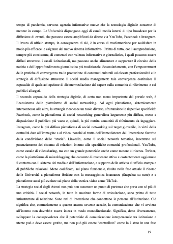 tempo di pandemia, servono agenzia informative nuove che la tecnologia digitale consente di mettere in campo. Le Università dispongono oggi di canali media interni di tipo broadcast per la diffusione di eventi, che possono essere amplificati da dirette via YouTube, Facebook e Instagram. Il lavoro di ufficio stampa, in conseguenza di ciò, è in corso di trasformazione per soddisfare in modo più efficace le esigenze del nuovo sistema informativo. Prima di tutto, con l’autoproduzione, sempre più consistente, di contenuti con valenza informativa e giornalistica, i quali possono essere diffusi attraverso i canali istituzionali, ma possono anche alimentare e supportare il circuito della notizia e dell’approfondimento giornalistico più tradizionale. Secondariamente, con l’empowerment delle pratiche di convergenza tra la produzione di contenuti culturali ad elevata professionalità e le strategie di diffusione attraverso il social media management: tale convergenza costituisce il caposaldo di qualsiasi opzione di disintermediazione del sapere sulla comunità di riferimento e sui pubblici allargati.