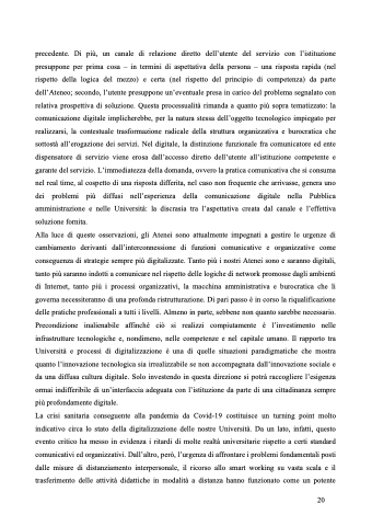 La crisi sanitaria conseguente alla pandemia da Covid-19 costituisce un turning point molto indicativo circa lo stato della digitalizzazione delle nostre Università. Da un lato, infatti, questo evento critico ha messo in evidenza i ritardi di molte realtà universitarie rispetto a certi standard comunicativi ed organizzativi. Dall’altro, però, l’urgenza di affrontare i problemi fondamentali posti dalle misure di distanziamento interpersonale, il ricorso allo smart working su vasta scala e il trasferimento delle attività didattiche in modalità a distanza hanno funzionato come un potente