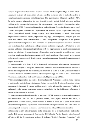 europee. In particolare attualmente è possibile scaricare il testo completo D.Lgs 101/2020 e tutti i documenti societari ed intersocietari ad esso correlati, compreso tutto il materiale relativo al complesso iter di recepimento. Vista l’importanza della pubblicazione del decreto legislativo AIFM ha anche messo a disposizione dei soci incontri formativi gratuiti fruibili attraverso webinar. All’interno del sito sono inoltre presenti link che rimandano a siti web di 4 importanti organismi internazionali: ICRP (International Commission on Radiological Protection, https://www.icrp.org), EFOMP (European Federation of Organisations for Medical Physics, https://www.efomp.org), IAEA (International Atomic Energy Agency, https://www.iaea.org) e IOMP (International Organization for Medical Physics, https://www.iomp.org). Questi organismi, svolgono gran parte della loro attività nella comunicazione e nella divulgazione, rivolgendosi a un pubblico specializzato nella comprensione della dosimetria e in particolare a specialisti che hanno familiarità con radiodiagnostica, radioterapia, radioprotezione, radiazioni impiegate nell'industria e nella scienza. Utilizzano principalmente piattaforme web che rappresentano un canale estremamamente rapido per migliorare la comunicazione e l’interazione con la comunità scientifica, ma è ormai superfluo sottolineare che dispongono quasi tutti di canali social su cui fornire rapidi aggiornamenti sullo stato di avanzamento di alcuni progetti e su cui sponsorizzare il proprio lavoro attraverso le pagine web dedicate.