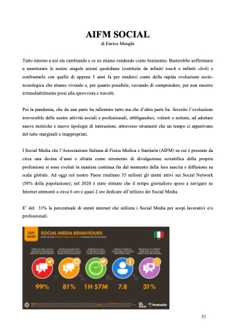 I Social Media che l’Associazione Italiana di Fisica Medica e Sanitaria (AIFM) su cui è presente da circa una decina d’anni e sfrutta come strumento di divulgazione scientifica della propria professione si sono evoluti in maniera continua fin dal momento della loro nascita e diffusione su scala globale. Ad oggi nel nostro Paese risultano 35 milioni gli utenti attivi sui Social Network (58% della popolazione); nel 2020 è stato stimato che il tempo giornaliero speso a navigare su Internet ammonti a circa 6 ore e quasi 2 ore dedicate all’utilizzo dei Social Media.