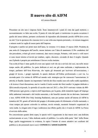 Una scelta di base è stata quella di avere uno spazio web che sia a servizio dei soci, ma nello stesso tempo anche del pubblico. La parte dedicata ai soci era già stata realizzata e implementata da tempo; parliamo dell’Area Riservata, che ospita gli strumenti per iscriversi all’associazione, i gruppi di lavoro, i gruppi regionali, lo spazio dedicato all’Ordine professionale e così via. La seconda parte è la vetrina di AIFM nel mondo web: strategica per far conoscere l’associazione, le attività, le finalità. Quanto sia importante l’attività dei fisici medici non solo nelle realtà ospedaliere e di ricerca è fuori discussione, ma lo è anche il ruolo sociale dei fisici medici: le pagine dedicate a Ilfisicomedicorisponde, lo sportello di ascolto nato nel 2013, a fine 2019 venivano visitate da 800- 1000 persone ogni giorno, a riprova dell’importanza, per la gente, delle tematiche legate all’impiego delle radiazioni ionizzanti e del rischio associato, e dei benefici enormi che ne derivano. Ionizzanti e non: AIFM NOIR (Not Only Ionizing Radiation), nato per portare anche all’interno di AIFM la tematica del 5G, grazie all’attività del gruppo è diventata punto di riferimento a livello nazionale, e viene sempre più spesso coinvolto in webinar, tavole rotonde, momenti formativi organizzati da varie realtà. Lo slogan sotto il logo è ambizioso ma riflette quello che è il ruolo di AIFM: La Fisica al servizio della salute.